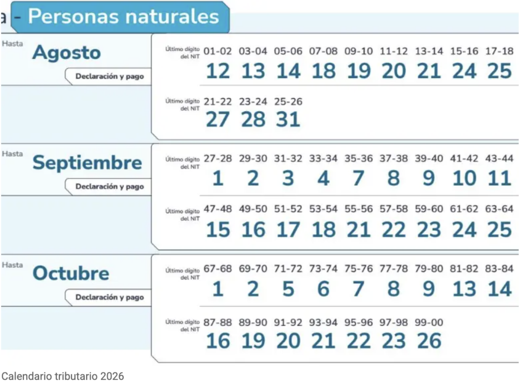 The filing window for personas naturales (individuals) runs from August 12 through October 26, 2026. Your specific deadline depends on the last two digits of your NIT (your Colombian tax ID number).